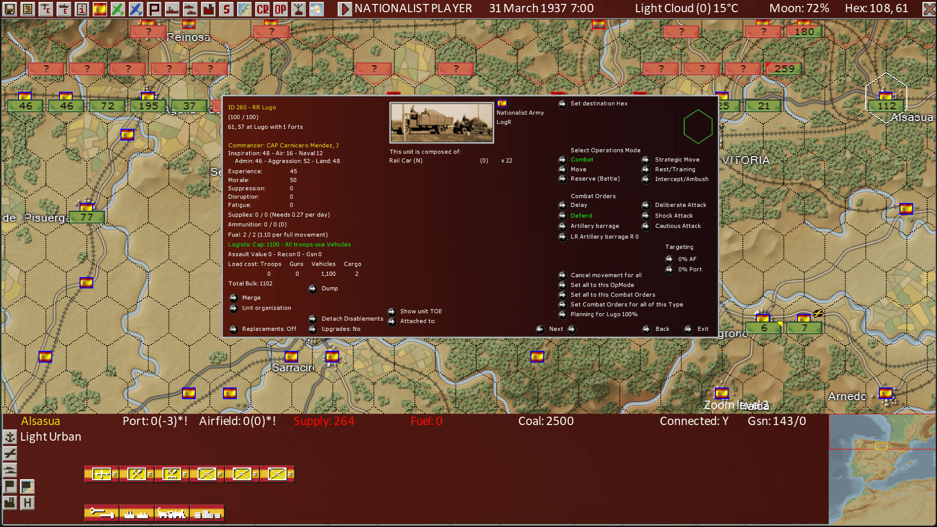 Both sides start with small, battalion and company level units, including many unorganized militia units. However, eventually both sides can build up their units into Regiments, Brigades and Divisions, thus fielding true WWII-like organizations. Engineers, base support units, truck units, cart and wagon units are represented as well as Infantry, armor, artillery and cavalry. Unique home grown armored car units are also present. A detailed rail system moves supply as well as troops.